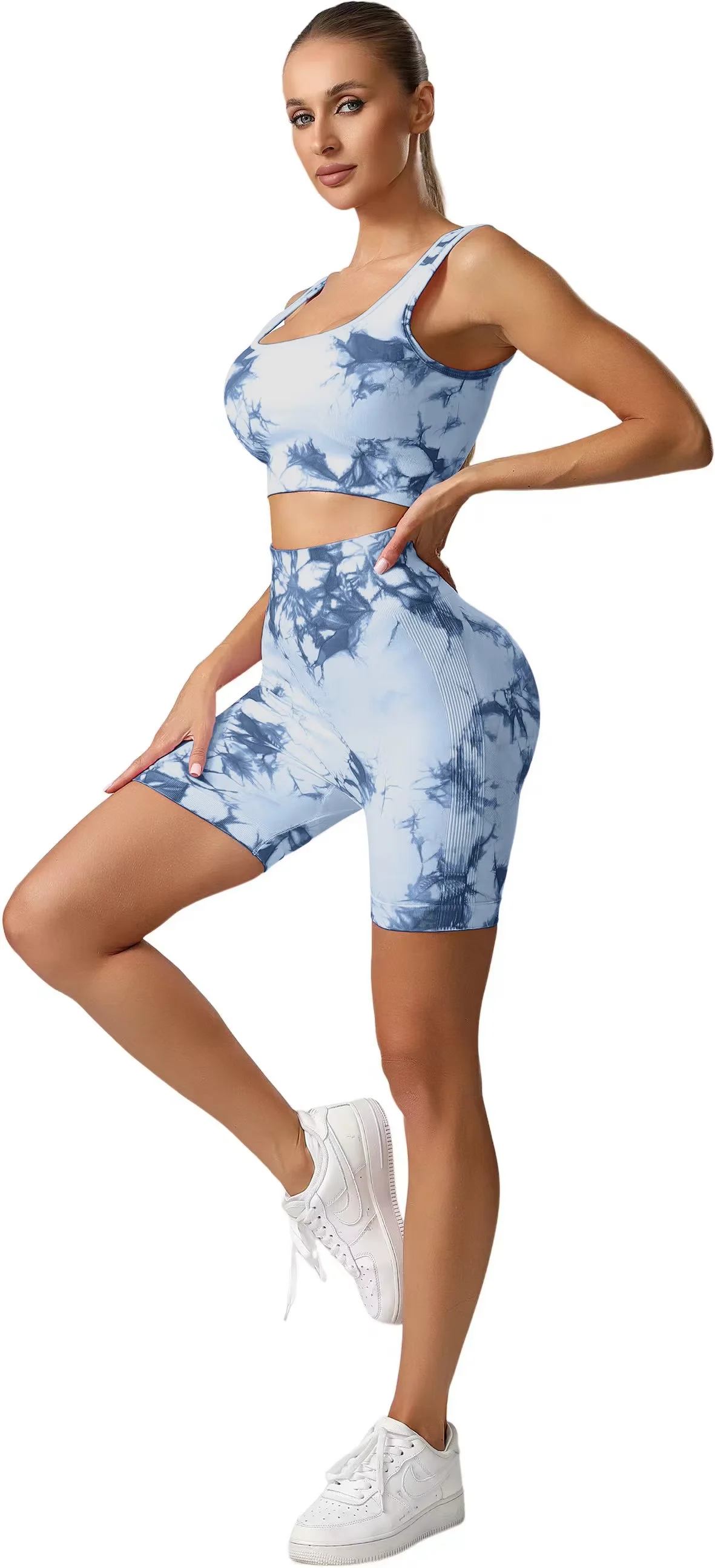 Hot Selling Trendy Multicolour 2 Piece Tie Dye Yoga Set High Waist Seamless Shorts with Sports Bra for Women